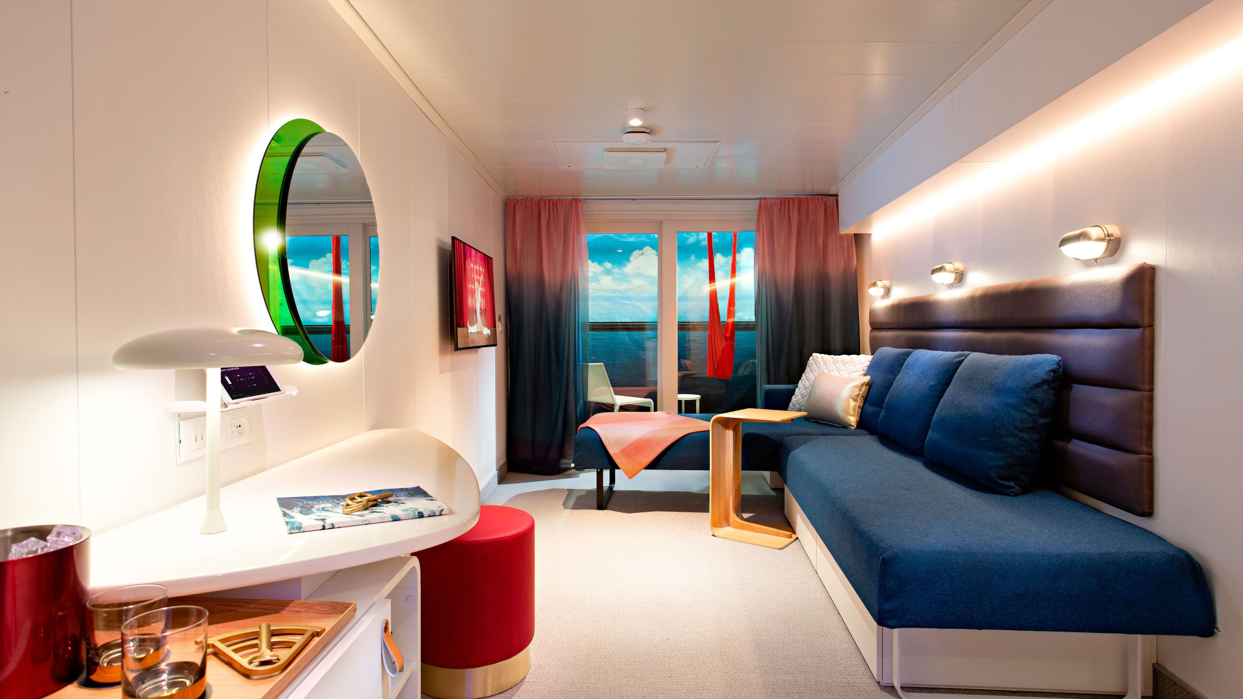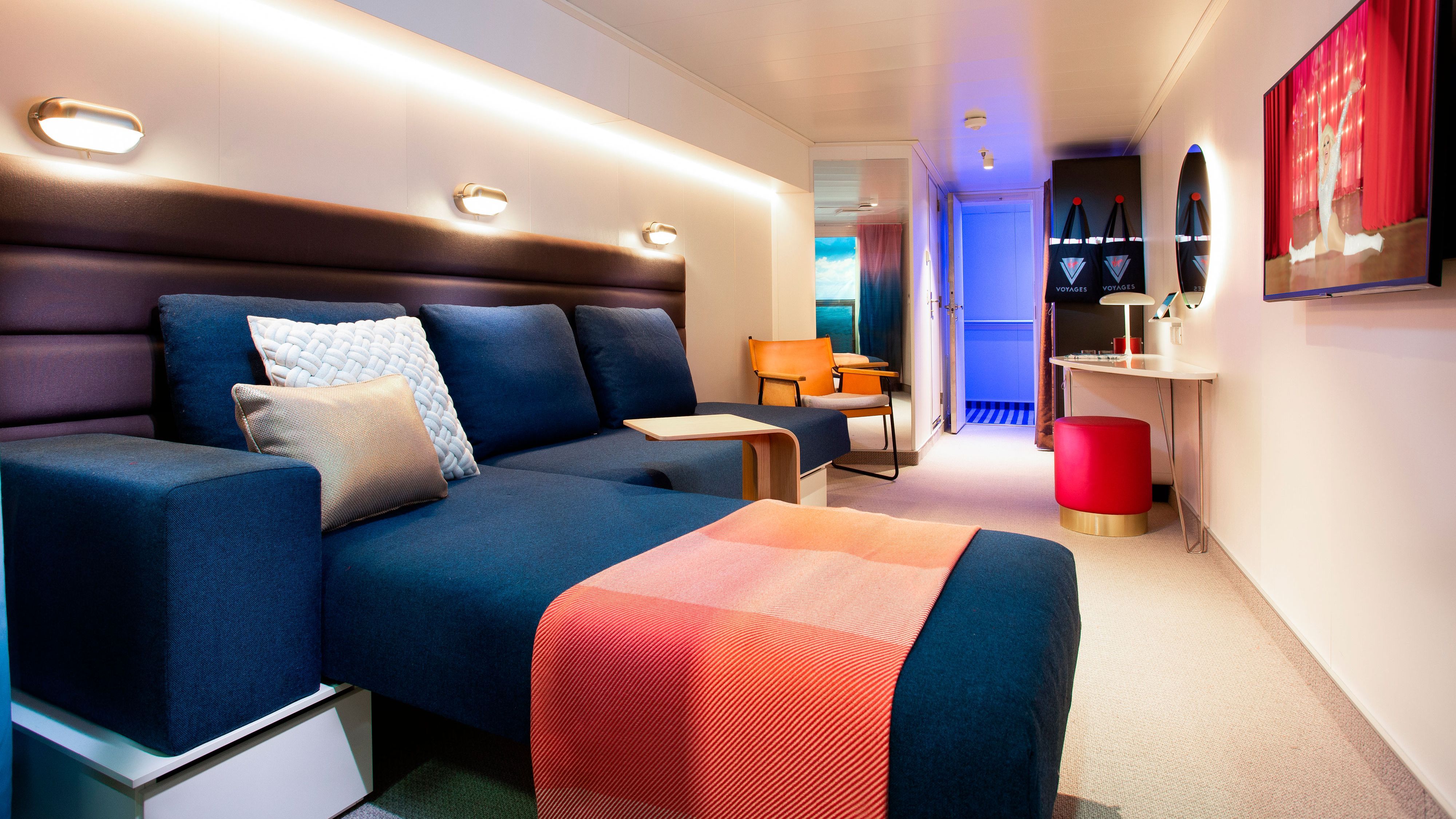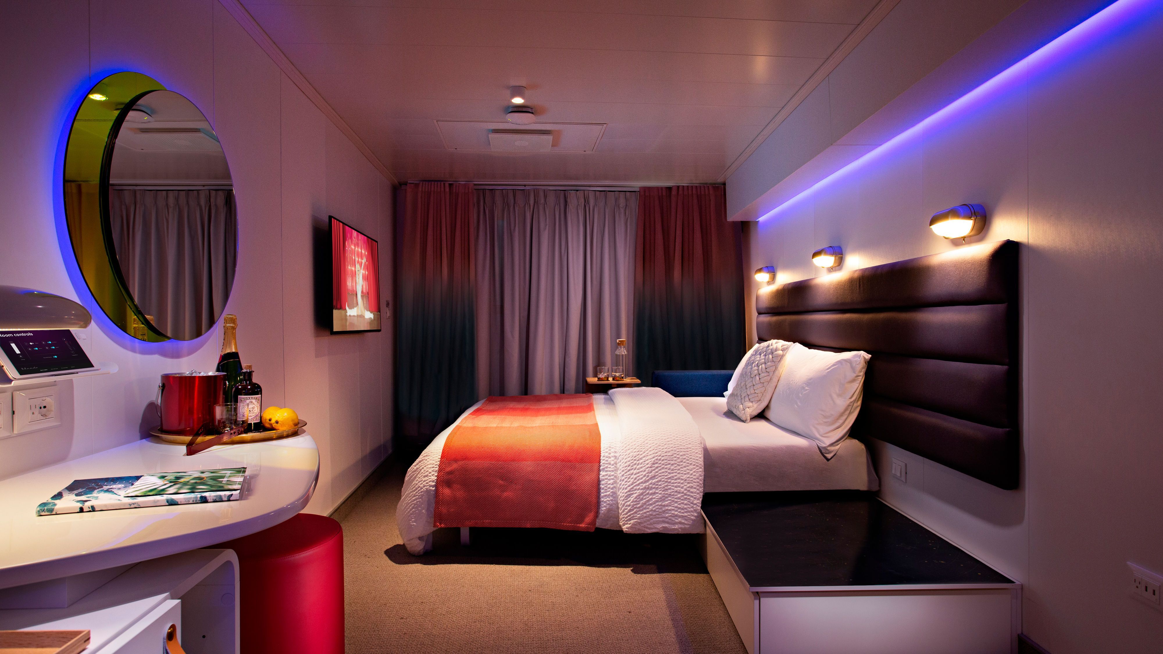 One of the cabins furnished by Walter K. on the first Virgin Voyages cruise ship.