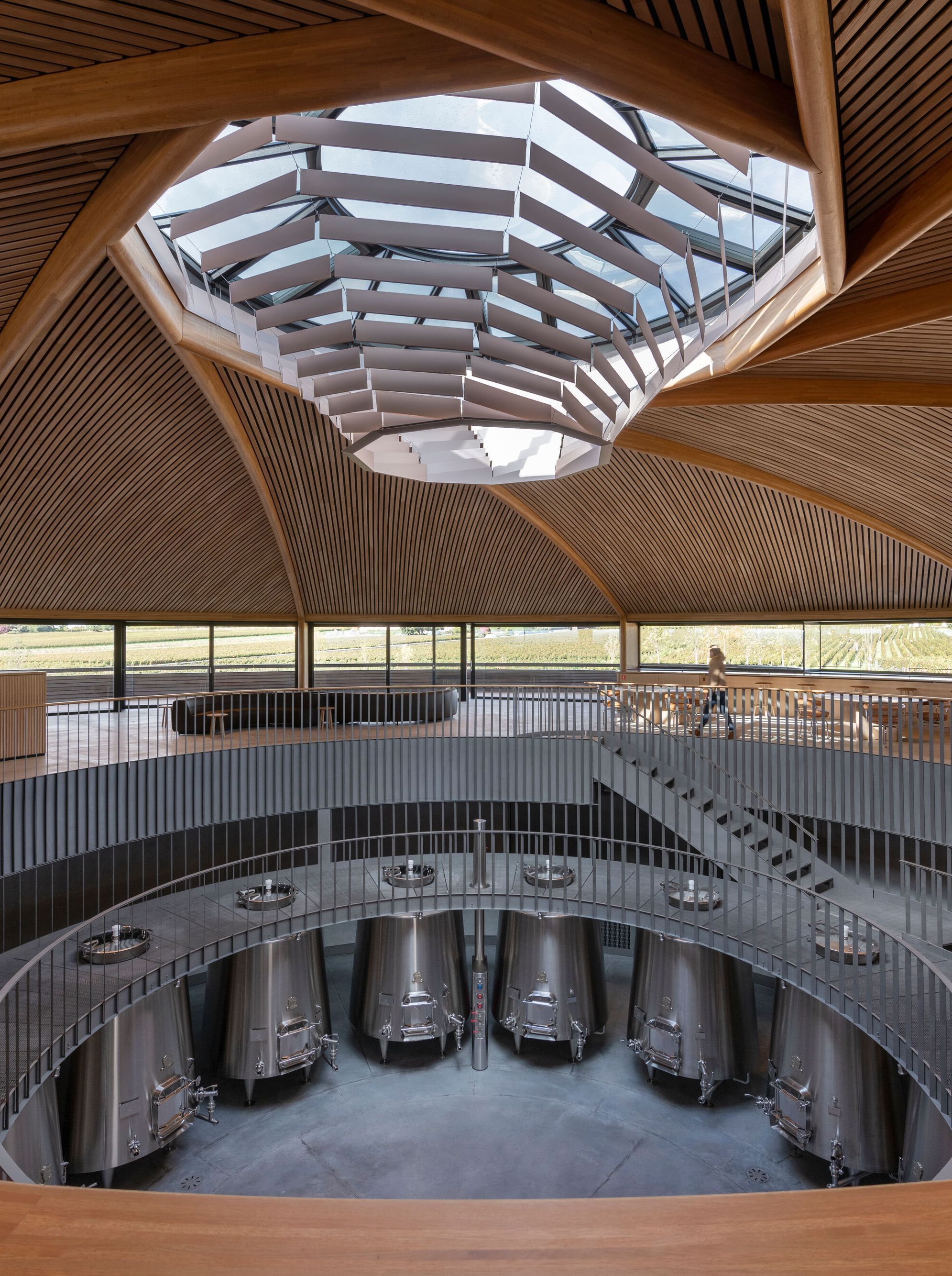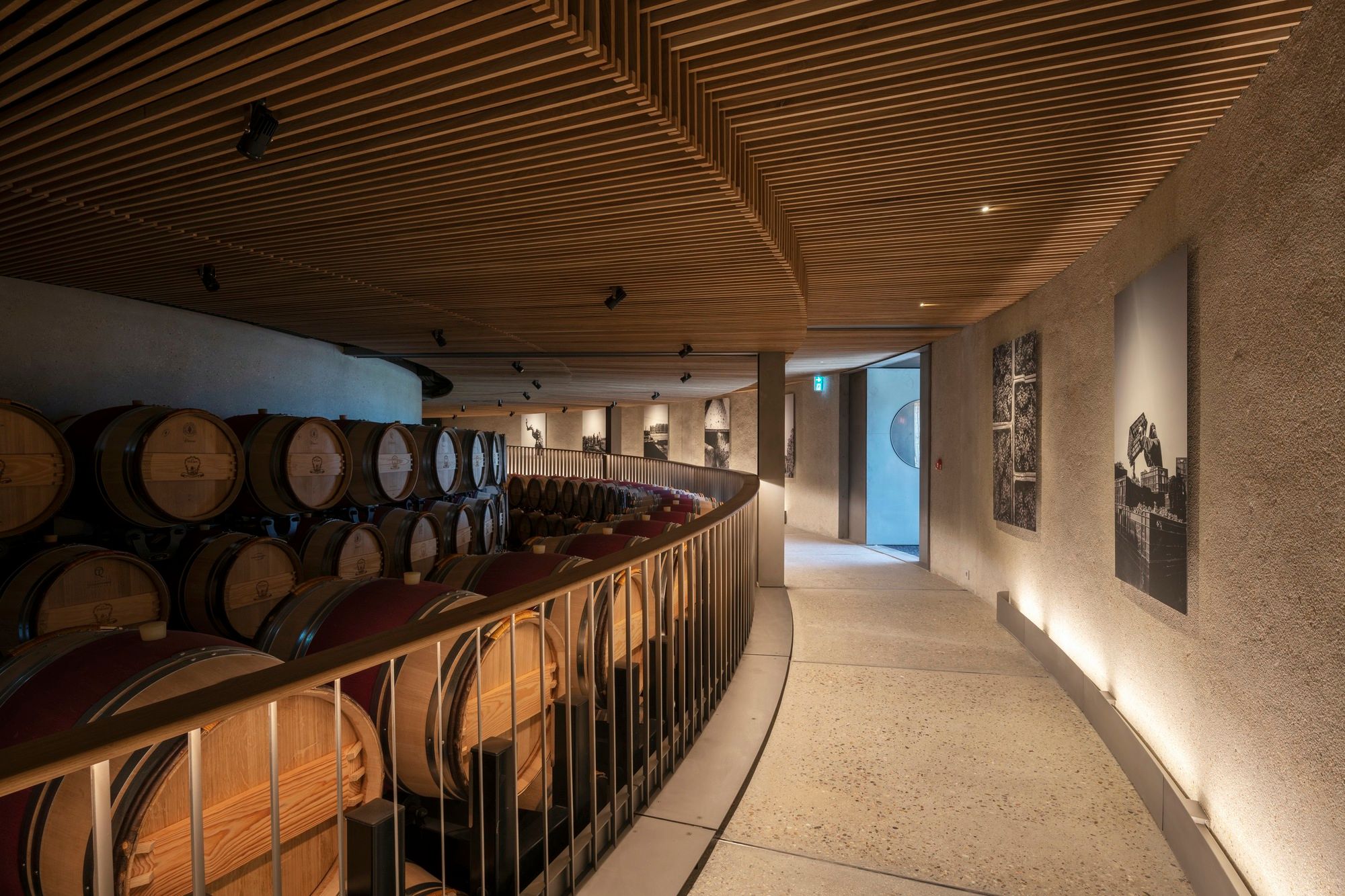 Two ramps – one external and one internal – allow wine enthusiasts to walk through the different stages of the wine process as they enter the building. The internal ramp leads to the light-filled upper gallery, where an elegant wine bar and tasting tables allow visitors to sample the internationally renowned Le Dôme wine.