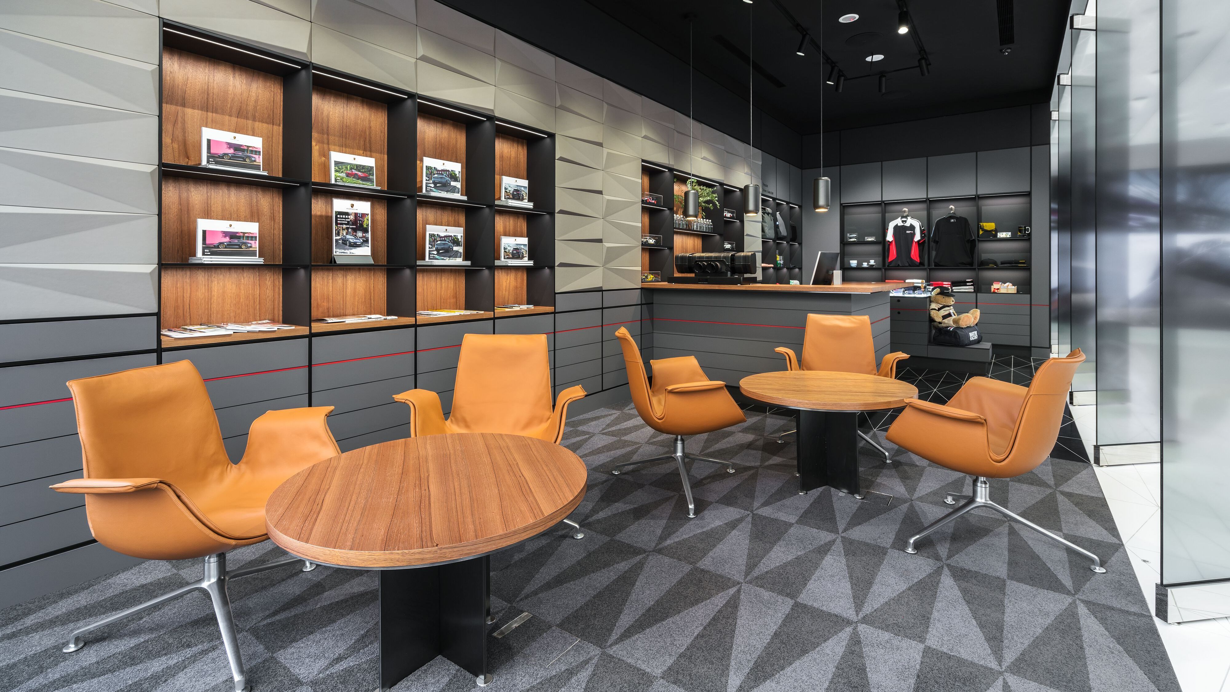 Our iconic FK chairs underline the elevated, high-class brand identity of the new Porsche Studio and invite visitors to a conversation.
