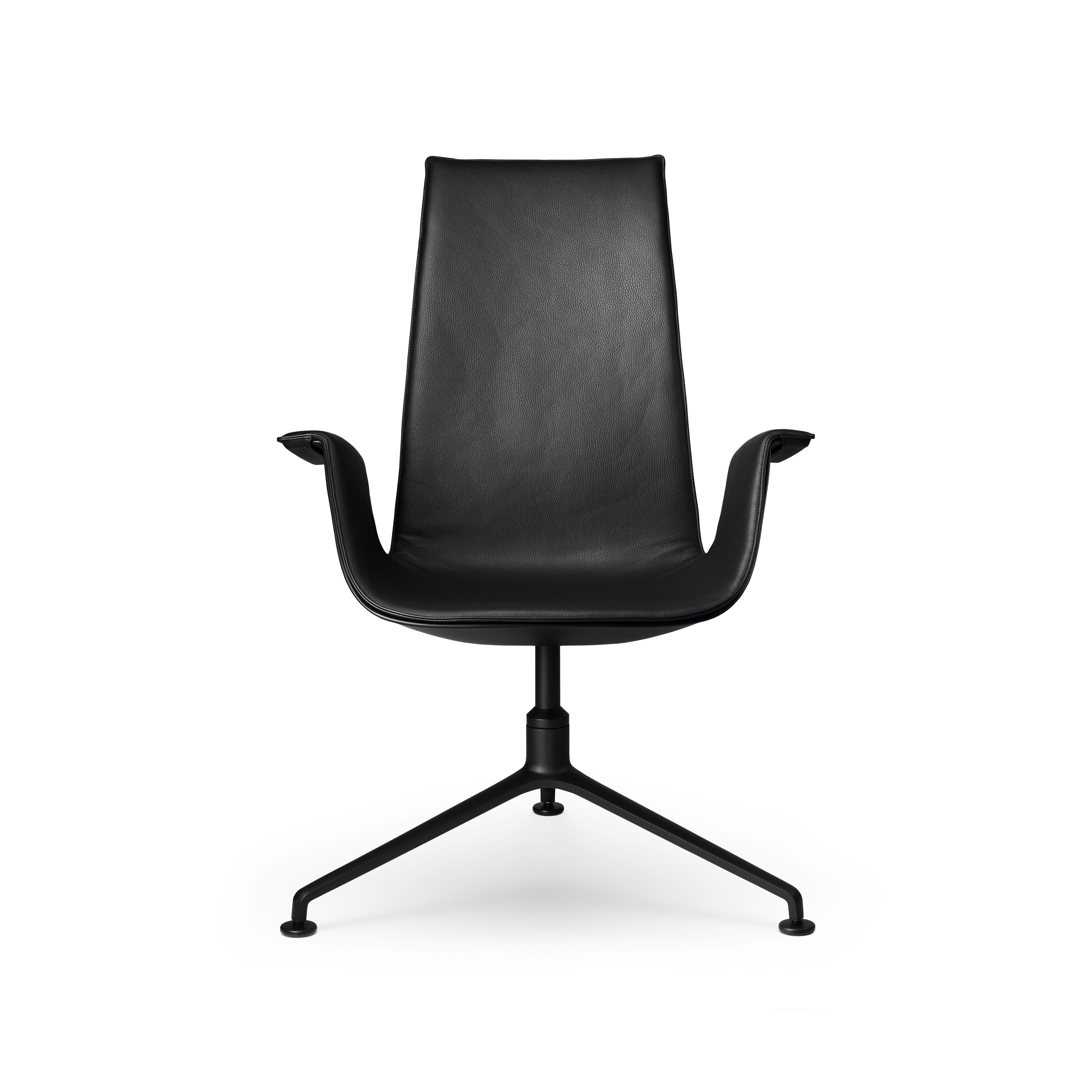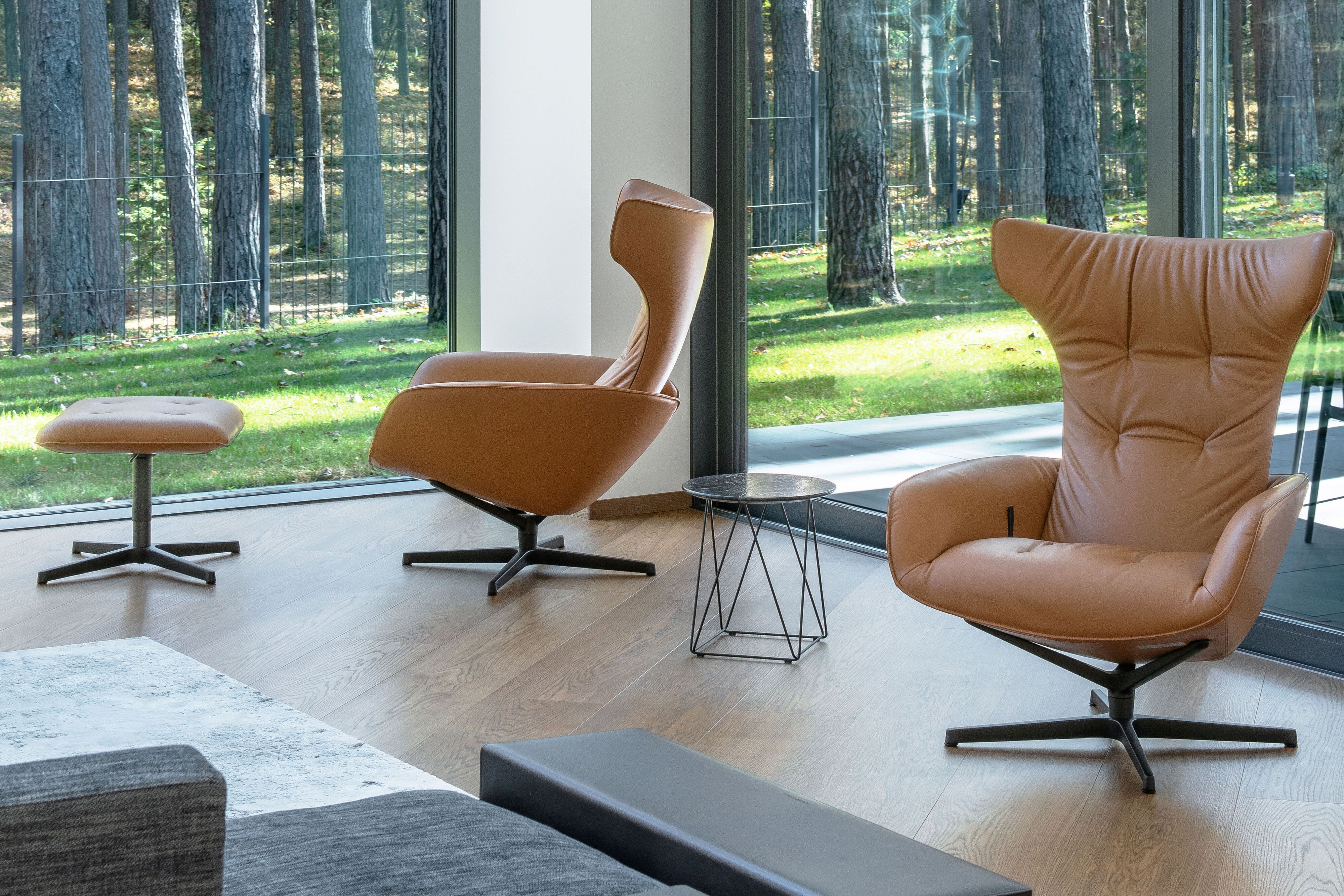 The colour of the fine oak floor boards is reflected in the leather of the Onsa Armchairs: We have used Elen leather in Tan. Elen leather in Fango is used in the home office for Healey Lounge. This leather gives visitors a feeling of quality and appreciation.
