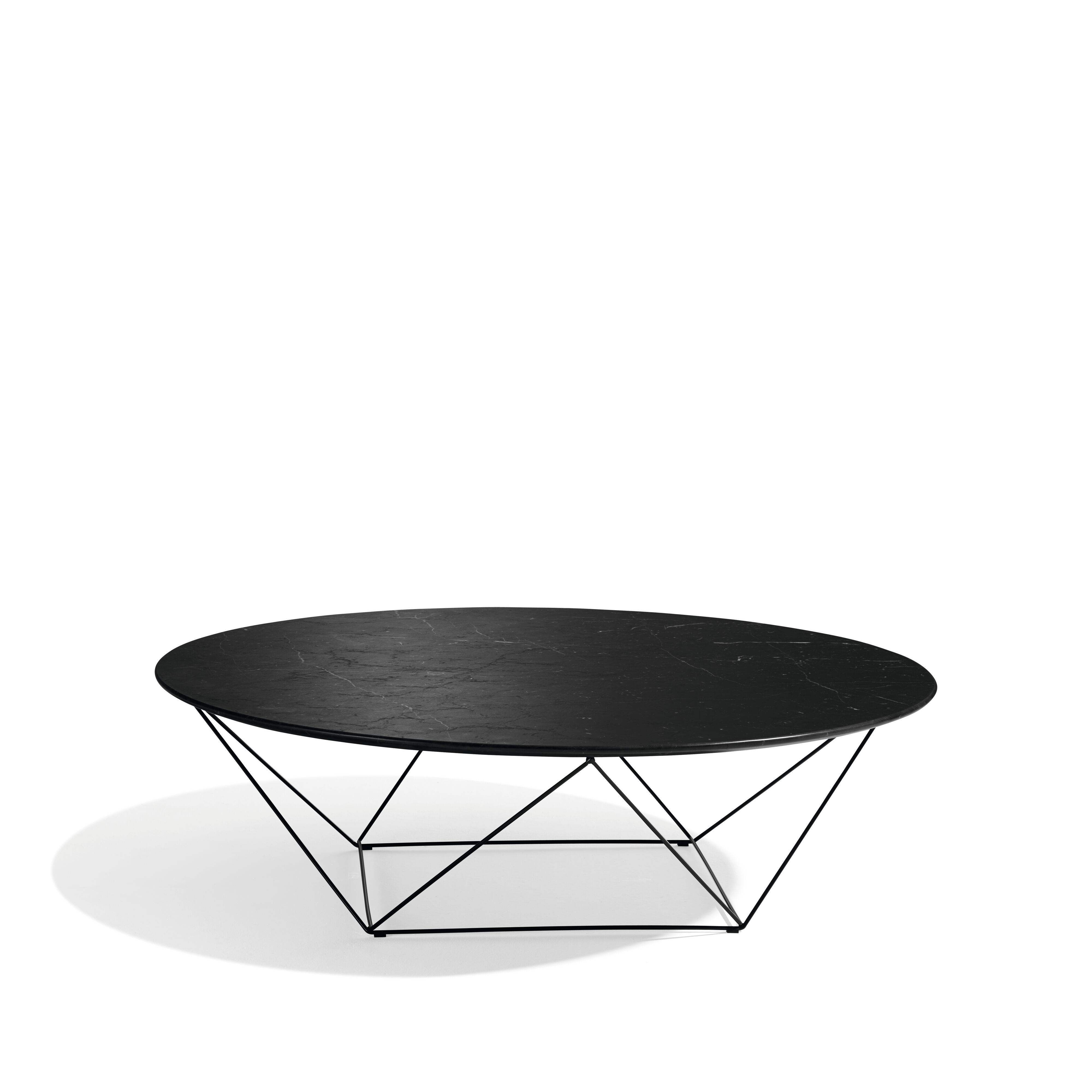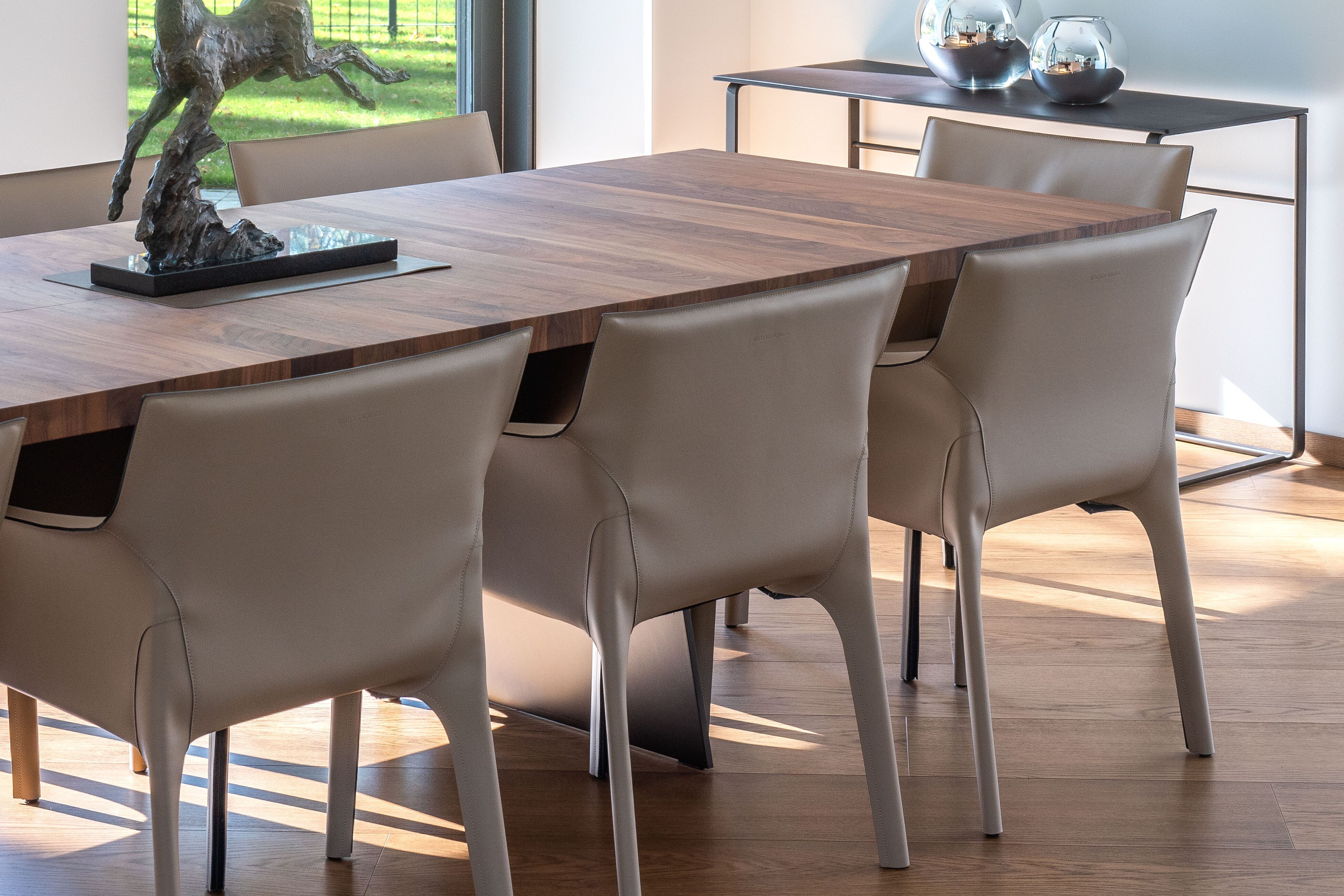 Different shades of brown complement each other and enhance the atmosphere of the room: Saddle Chairs in sand-coloured Paco leather, nutwood for the Tadeo Table, and precious Noir Saint Laurent marble for the Tama Table.