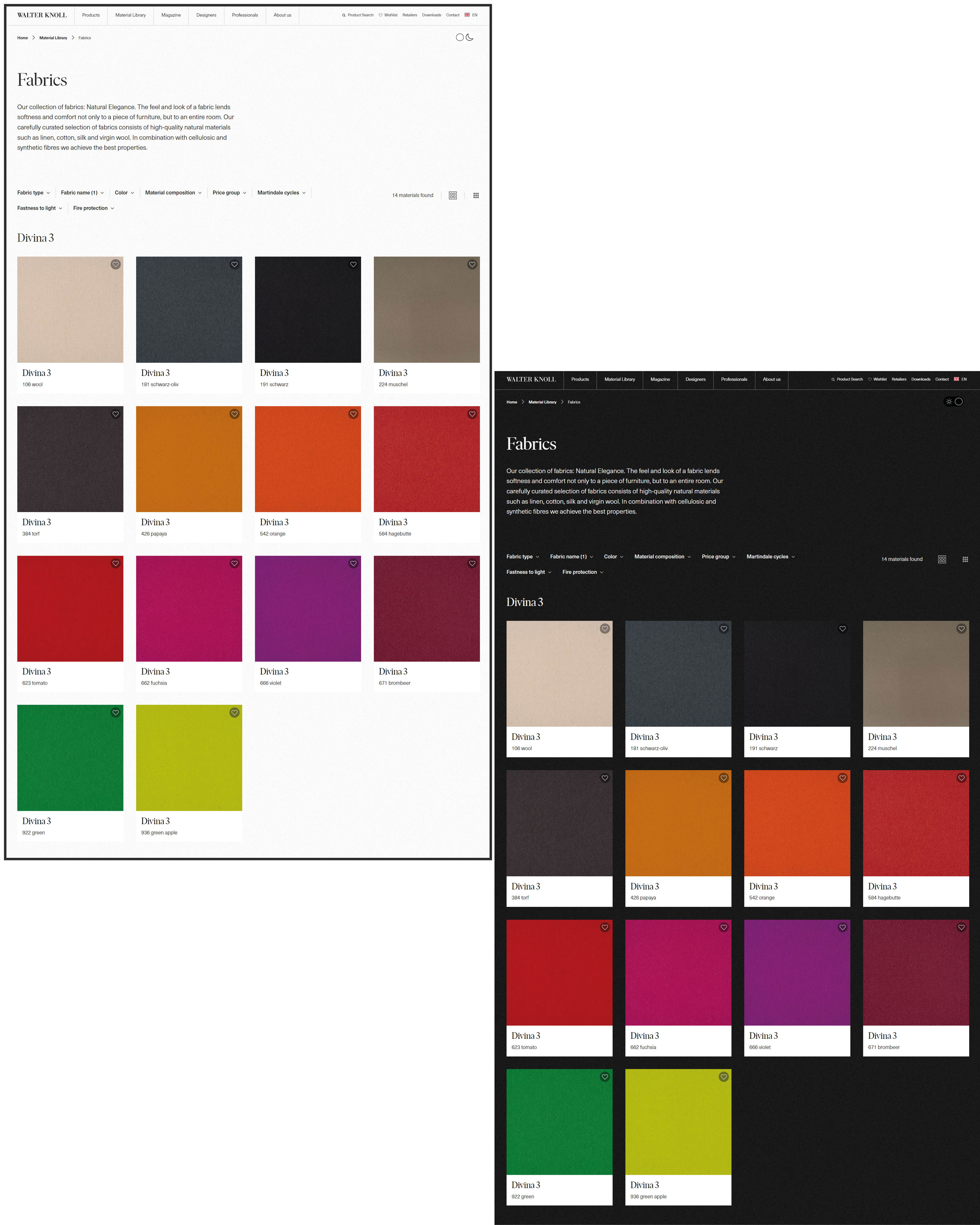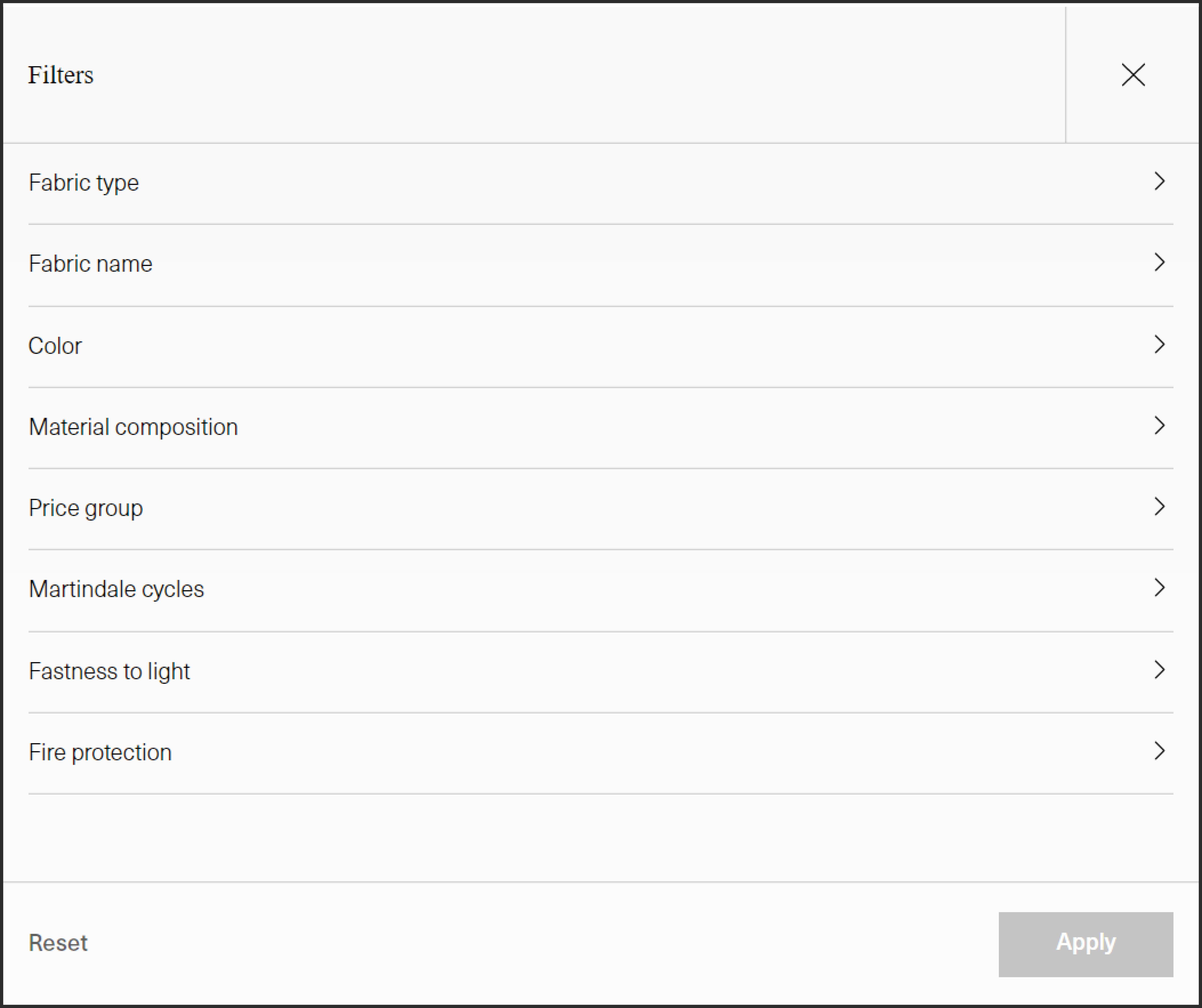 Interior professionals can search our library using many different criteria and filter the materials by category. Choose from price groups, colors, composition or subcategories – there is a selection of specific filters depending on the type of material.