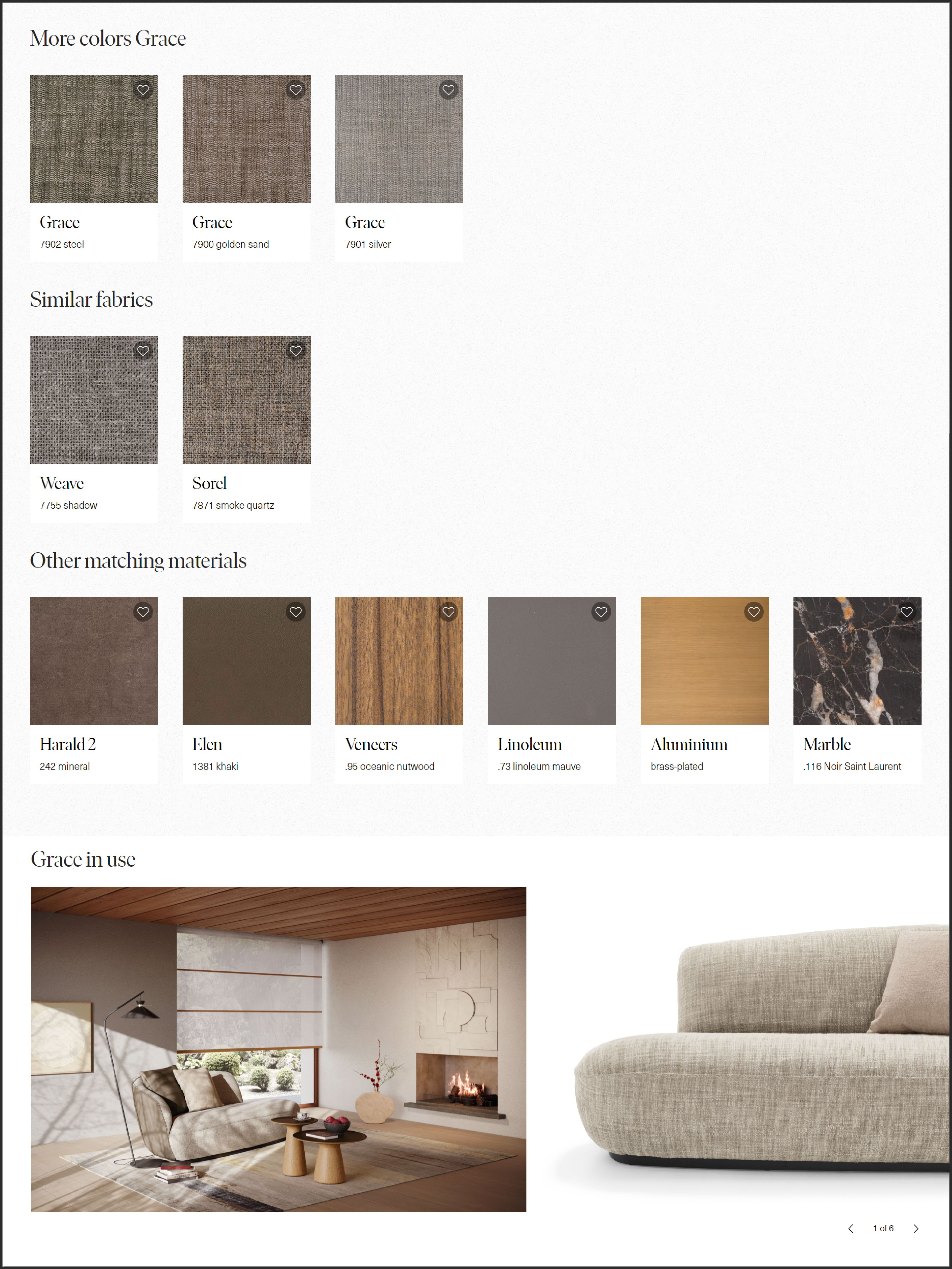 We have also listed additional color options for each material and offer suggestions for similar or suitable materials from other categories. You can also see how the material will look in actual use on a piece of furniture.