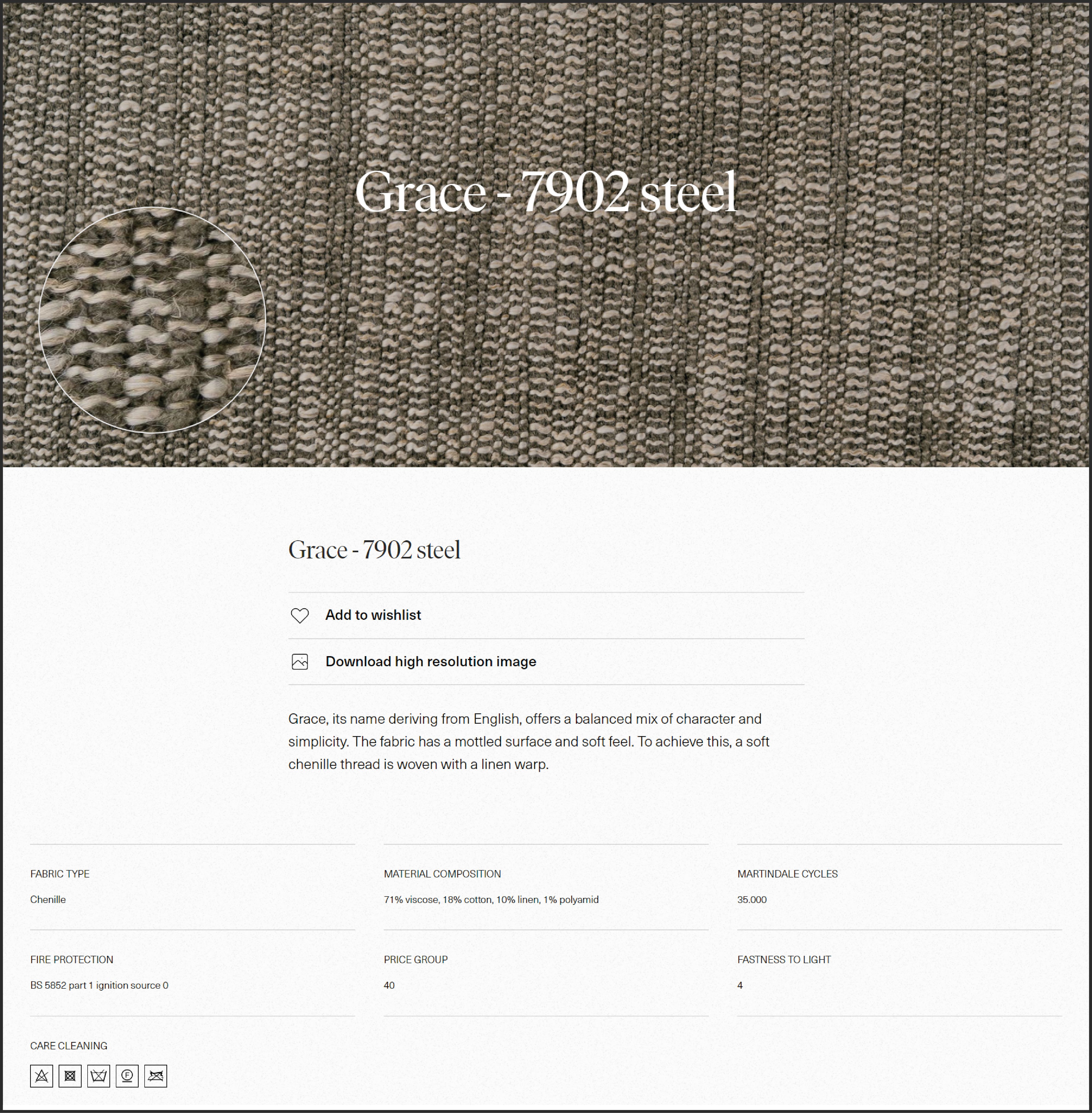 You will find all the relevant information for each material on its detail page. A magnifying glass allows you to take a closer look at the material and get a sense of its look and feel.