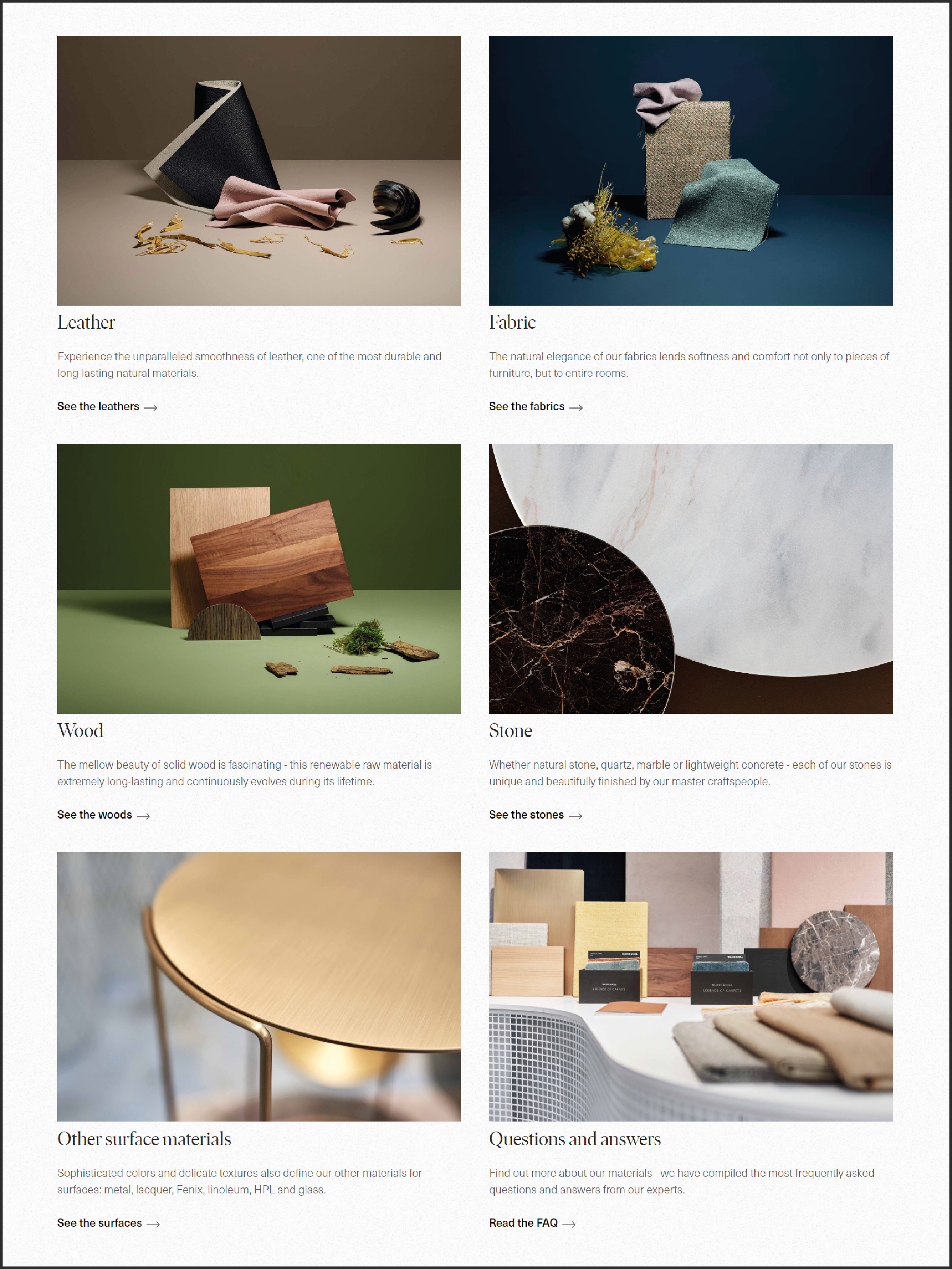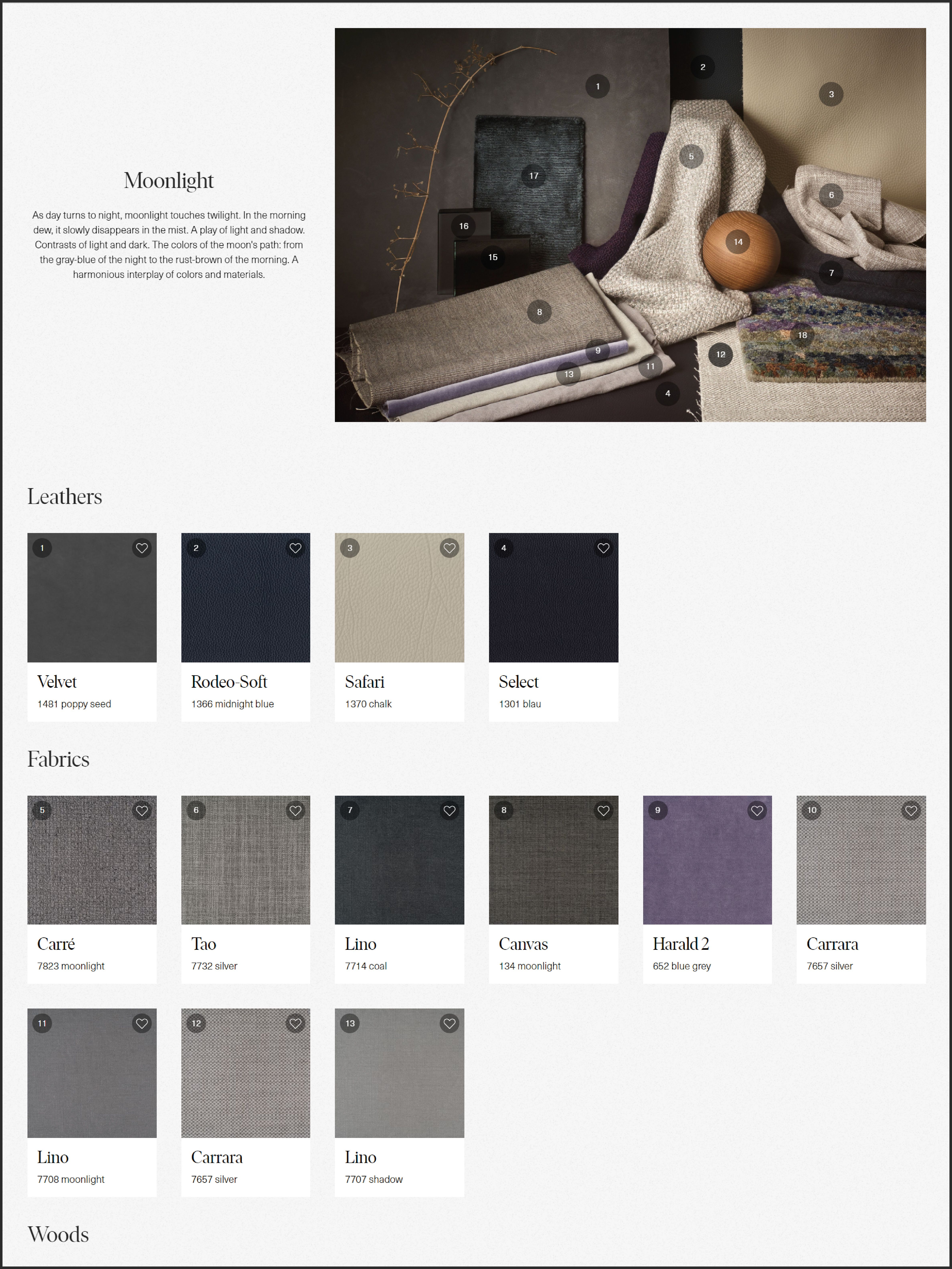 Which colors match each other? Which materials can be combined harmoniously? We have put together our fabrics, leathers, woods, and carpets in carefully curated mood boards for inspiration. Click on one of the collages to see full details of the materials shown.