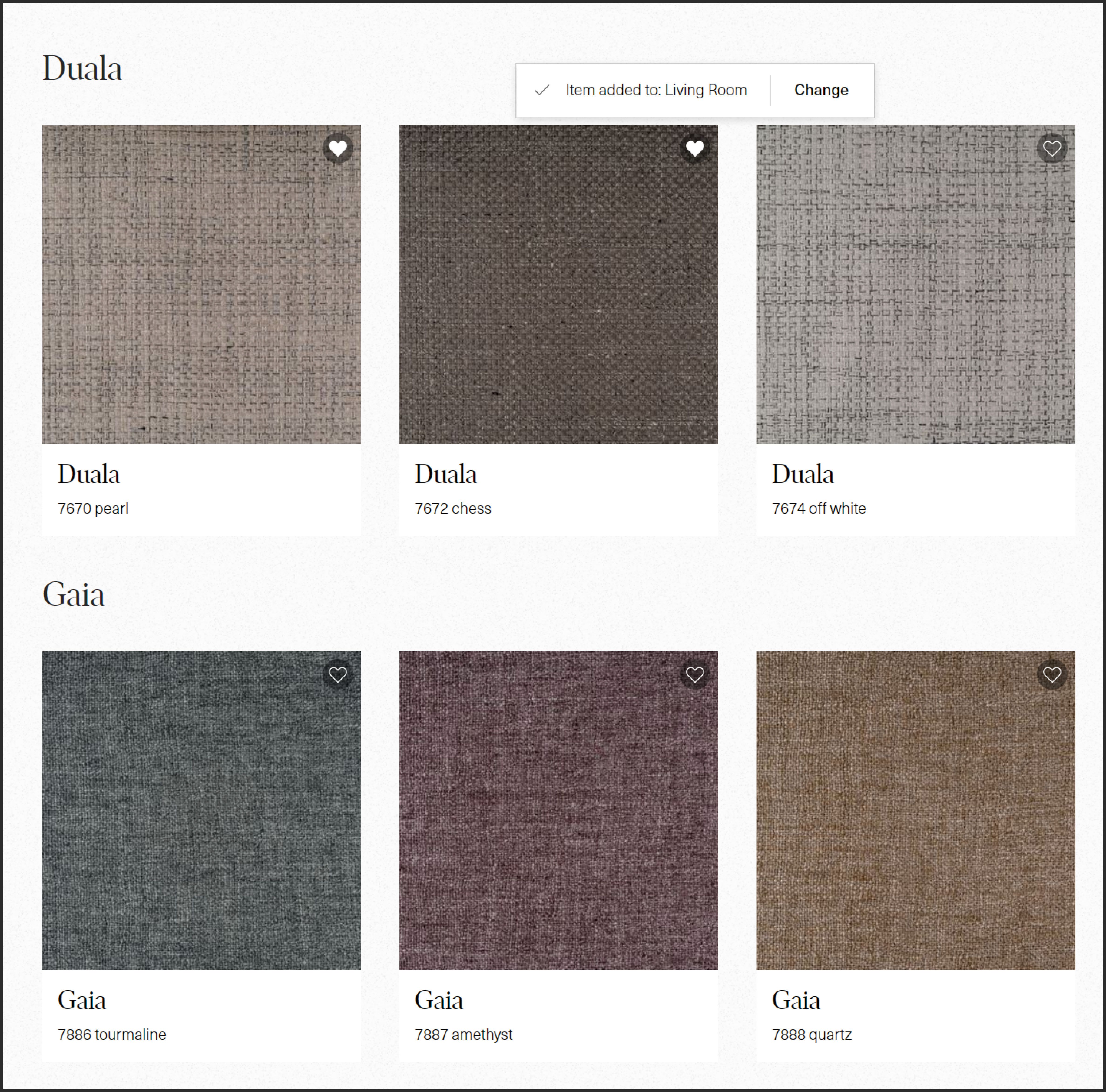 Next to each material in our Material Library, you will find a small heart symbol that you can click on. By touching or clicking on the icon, the material and color will be saved to a wish list (existing or new). Create as many wish lists as you like and use them to bookmark different materials for your projects.